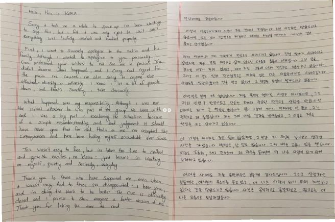 코알라는 자필 사과문에서 이번 사건에 대해 전적으로 자신의 책임이라고 인정했습니다. 그는 처음 폭력을 행사한 사람이 자신은 아니었으나, 가해자가 자신의 일행 중 한 명이었으며, 사건 당시 단순한 오해와 잘못된 판단으로 상황을 악화시키는 데 큰 역할을 했다고 솔직하게 밝혔습니다. 코알라는 "일이 그렇게까지 커져서는 안 됐고, 그건 전적으로 제 잘못이다"라며 자신의 책임을 깊이 통감하고 있음을 드러냈습니다. 이어 그는 이미 결과를 받아들이고 있으며, 그 이후로 계속 책임을 지고 살아가고 있다는 점을 강조했습니다. 특히 그는 "이 과정을 마주하는 것은 쉽지 않았지만, 그만큼 저 자신을 돌아보고 성장할 시간을 가졌다"며 변명이나 남 탓이 아닌 자신의 잘못을 인정하고 앞으로 더 나은 사람이 되기 위해 노력하고 있다고 밝혔습니다.