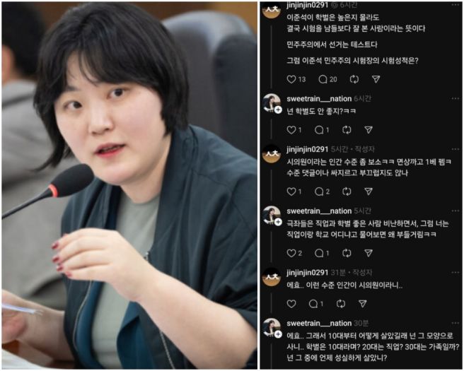 여기에 인천시의회 소속 이단비 의원이 댓글로 등장했습니다. 그는 해당 게시글에 대해 "넌 학벌도 안 좋지?ㅋㅋ"라는 댓글을 남겼고, 이것이 문제가 되었습니다. 이 댓글이 공개되자 많은 누리꾼들이 "학벌을 비하하는 발언"이라며 거세게 항의하기 시작했고, 결국 댓글 논쟁은 걷잡을 수 없이 확산되었습니다.