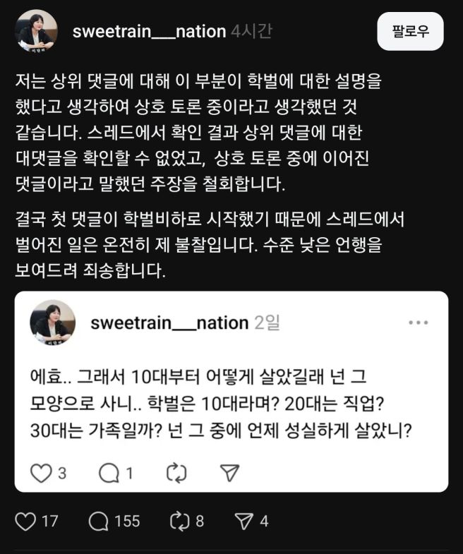 논란이 커지자 이 의원은 자신의 SNS에 사과문을 게재했습니다. 그는 "수준 낮은 언행을 보여드려 죄송하다"면서 자신의 잘못을 인정하고, 논쟁이 벌어진 댓글이 잘못된 내용이었음을 시인했습니다.