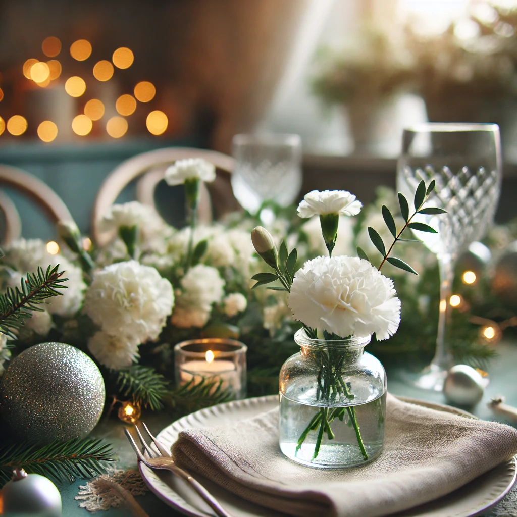 테이블 중앙에 작은 꽃다발이나 초록색 가렌드를 놓아보는 건 어떨까요? 크리스마스 리스나 솔방울, 유칼립투스 잎사귀 등의 자연소재 데코를 활용하면 따뜻하면서도 시즌에 어울리는 분위기가 연출됩니다. 굳이 전문가처럼 플로럴 디자인을 할 필요는 없어요. 투명한 유리화병에 단순한 화이트 카네이션 몇 송이만 꽂아도 금세 분위기가 아늑해진답니다💐
