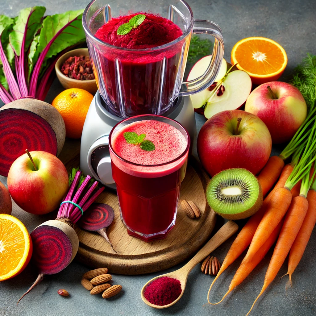 빨간색 채소와 과일을 활용한 디톡스 주스는 피부 미용과 혈액 순환에 좋습니다.